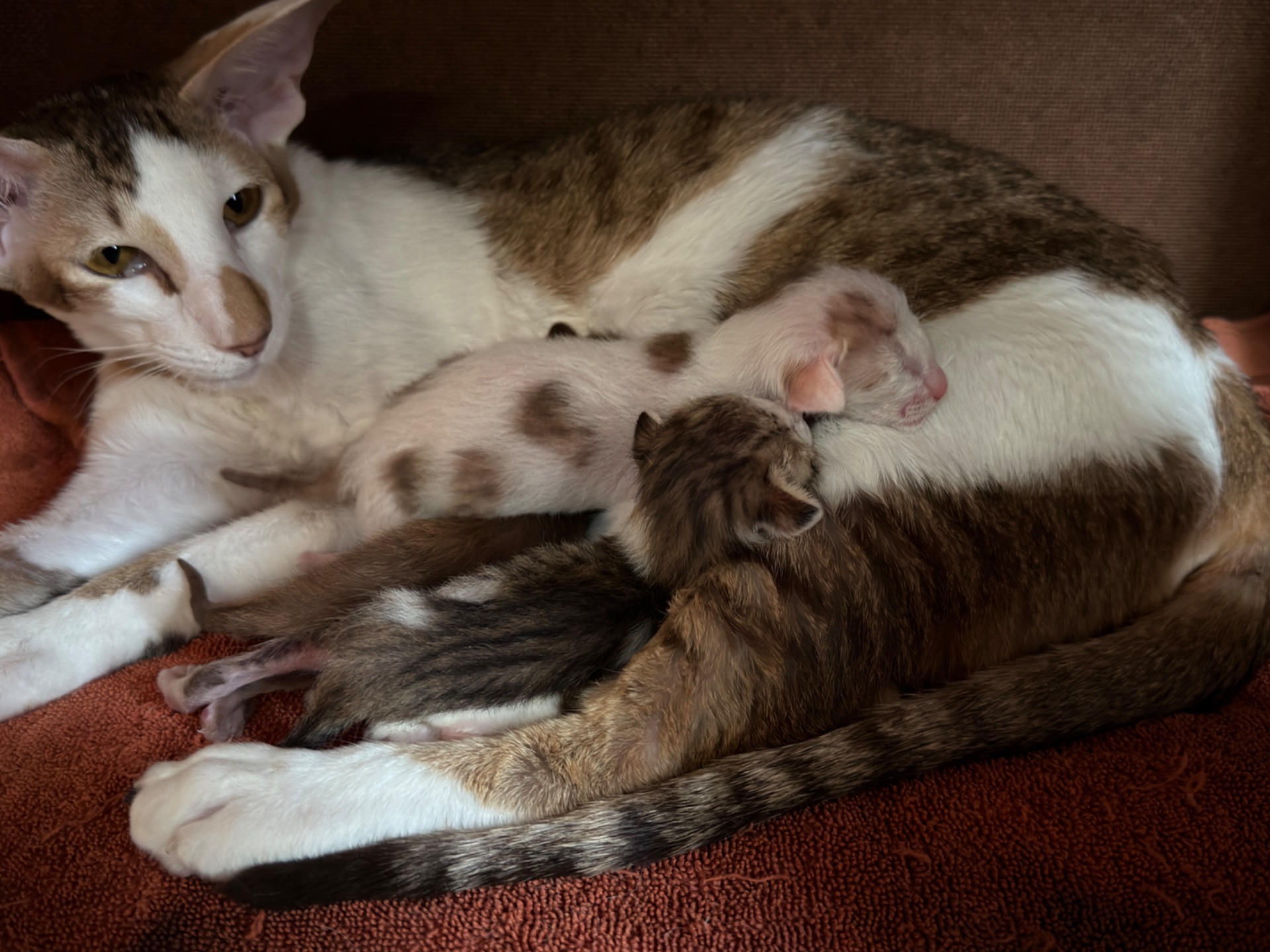 une petite merveille, avec un contraste élégant entre ses taches brown et son blanc immaculé. Calme mais joueuse, elle observe avant d'agir, puis joue avec ses frères avant de venir se reposer bien au chaud.